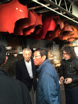 6枚目の写真は浅草から車で30分ほど、足立区にある染革工場です。このあたりには昔は染革工場が多くあったそうですが、多くが大型化して郊外に移転し、今ではこの辺りにはこの一社のみだそうです。社長は30年前のままの機械でやっているので、今では最新型の工場にはかなわないとおっしゃっていましたが、エゾシカのようにロットが少ない製品を頼むにはこうした小さな工場が大切です。